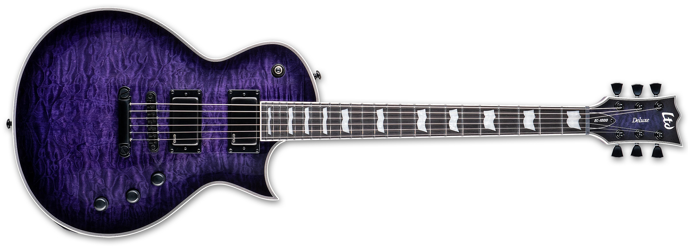 This EC-1000 offers an amazing quilted maple top in See Thru Purple Sunburst finish. Ready for pro-level performances in any genre of music, this guitar offers a set-thru three-piece mahogany neck at classic 24.75” scale, along with a mahogany body. Its Macassar ebony fingerboard has ESP flag inlays and 24 extra-jumbo stainless steel frets for excellent longevity and the smoothest string bending experience.